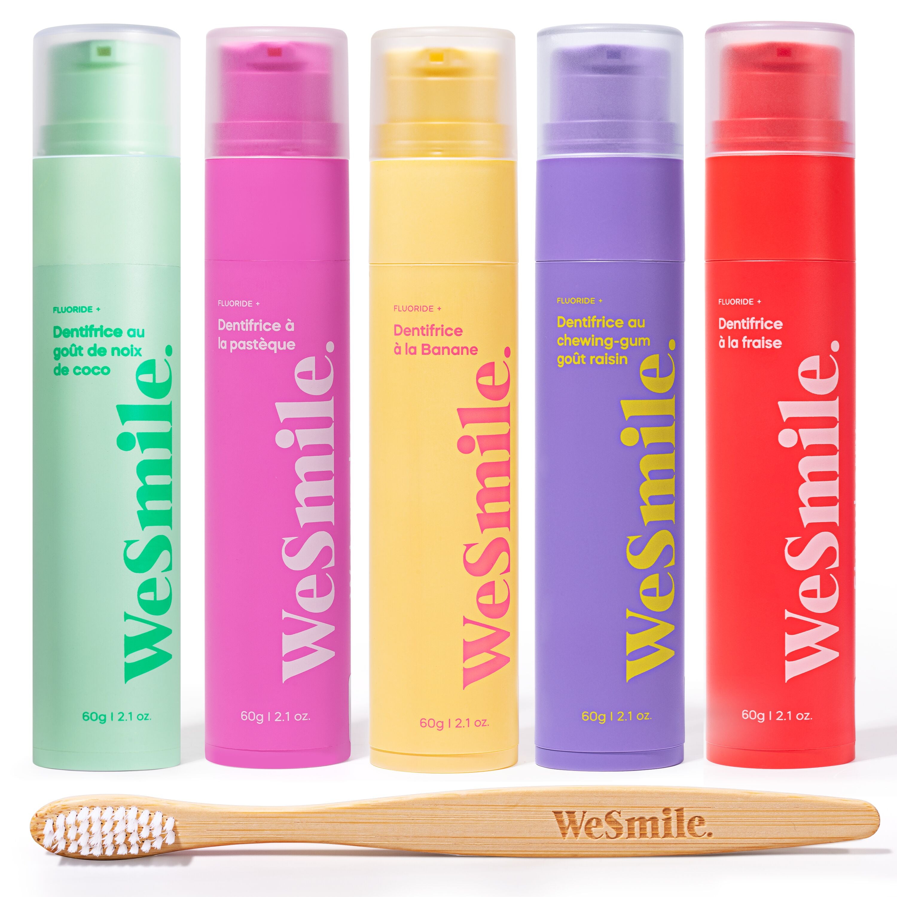 Pastèque 🍉, Banane 🍌, Raisin🍇, Fraise, Coco 🥥 ? Peu importe votre choix, tous nos dentifrices blanchissent vos dents et vous offrent la même protection